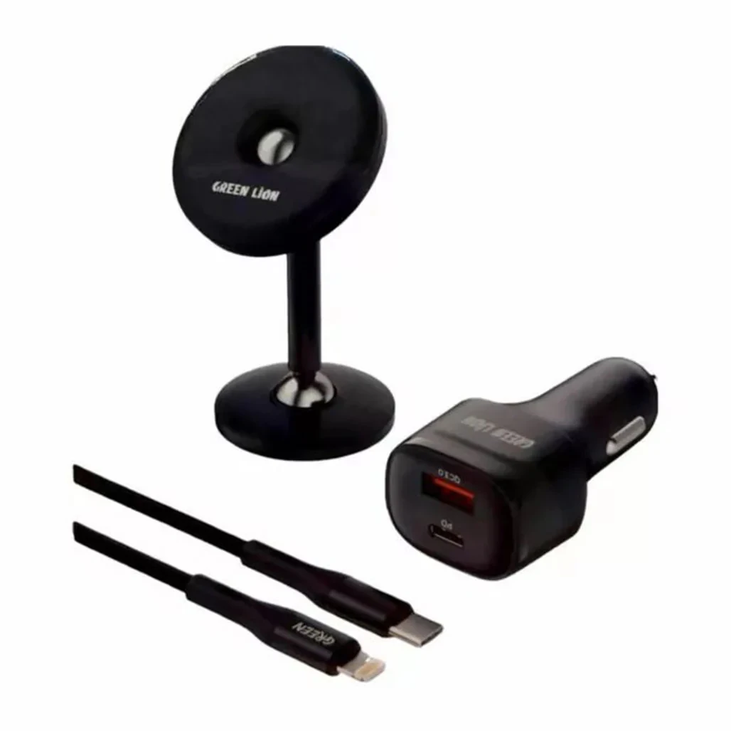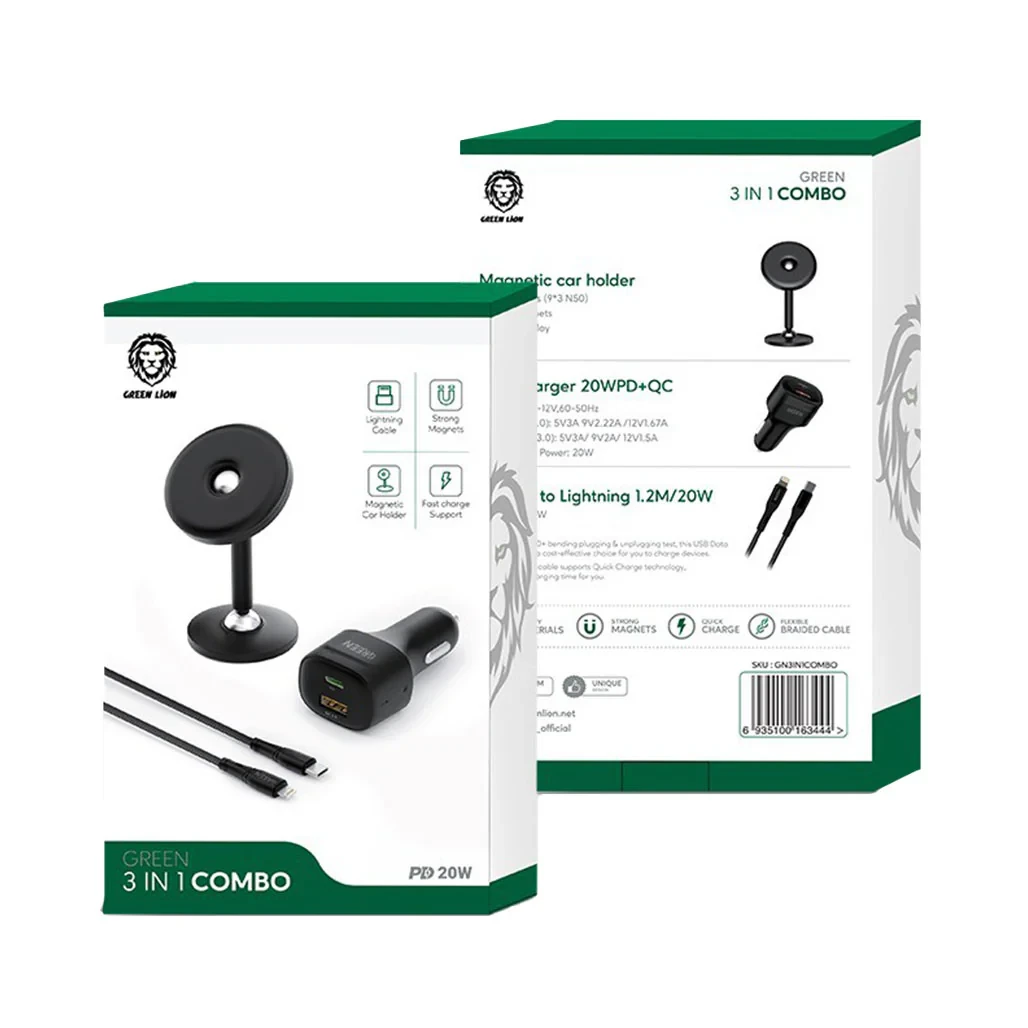 The Green Lion 3-in-1 Combo offers a comprehensive solution for all your charging and mobile accessory needs. This versatile set includes a high-quality 1.2-meter USB-C to Lightning cable, a dual-port car charger, and a robust magnetic car holder. Designed for efficiency and convenience, this combo ensures you have everything needed for fast and reliable charging on the go.