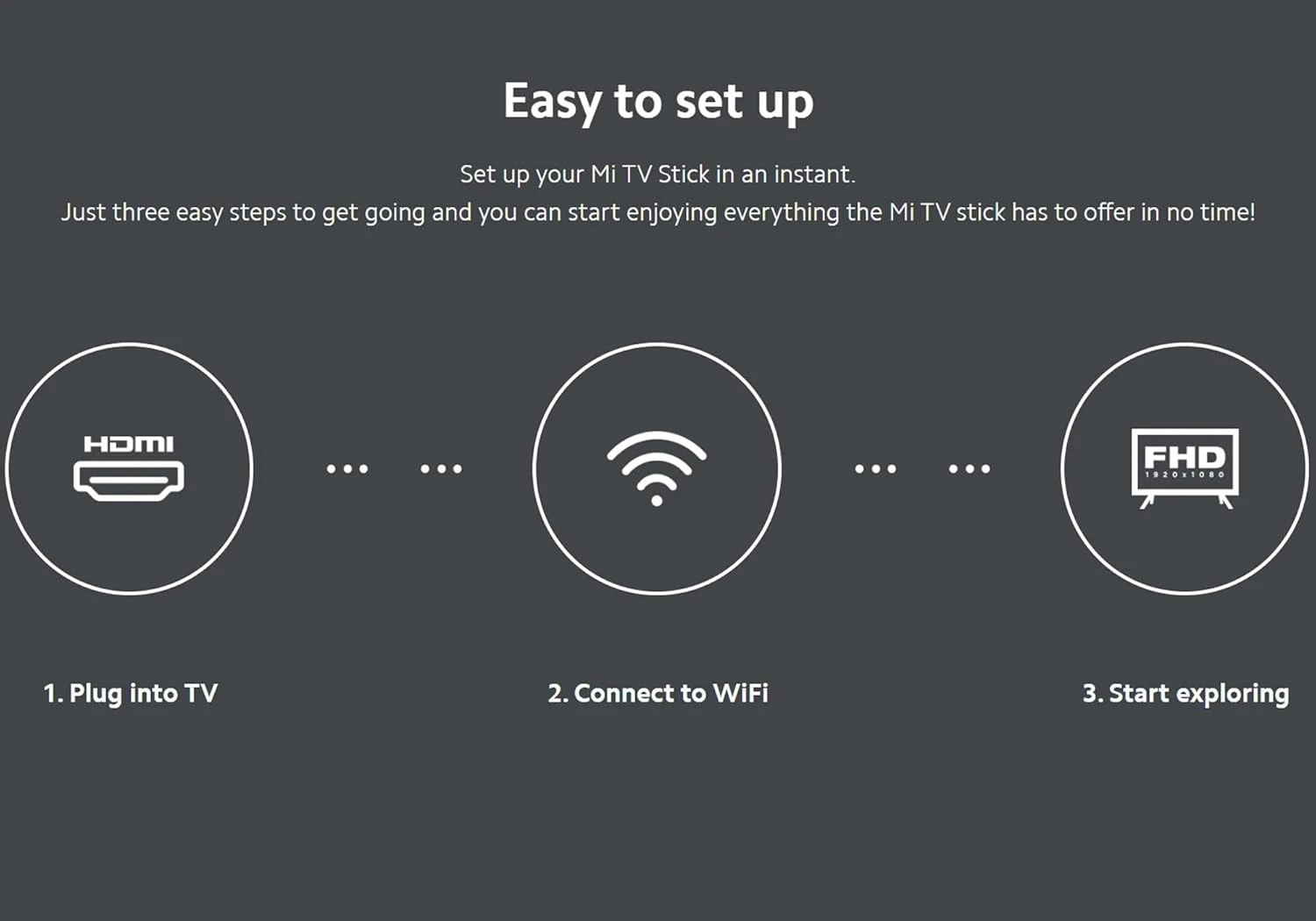 • Easy to set up: Set up your Mi TV Stick in an instant. Just three easy steps to get going and you can start enjoying everything the Mi TV stick has to offer in no time!