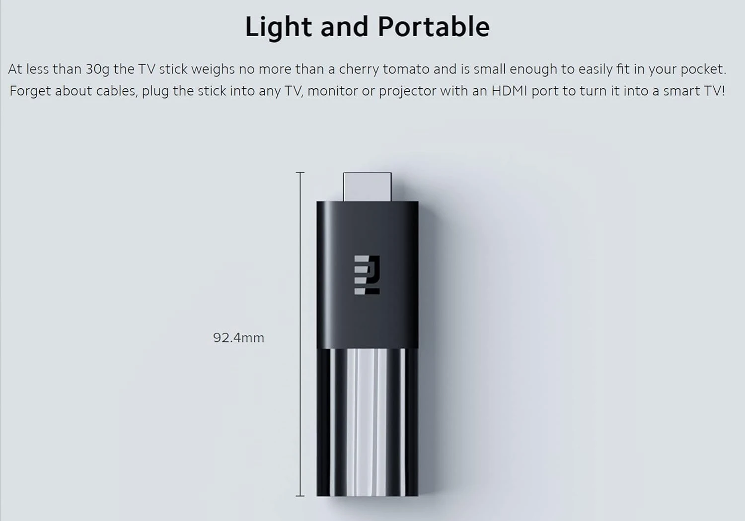 • Light and Portable: At less than 30g, the TV stick weighs no more than a cherry tomato and is small enough to easily fit in your pocket. Forget about cables, plug the stick into any TV, monitor or projector with an HDMI port to turn it into a smart TV!